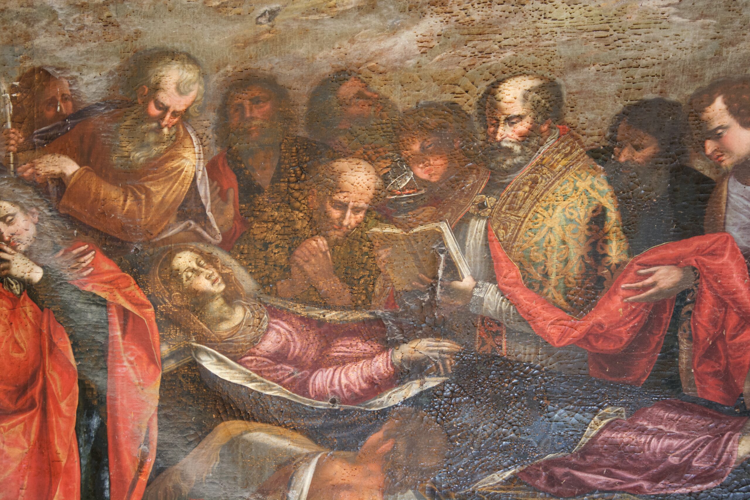 La prima è quella del “Dormitio Virginis”: essa rappresenta due scene consequenziali riunite in un unico dipinto; la parte inferiore vede raffigurata la “dormizione” della Vergine vera e propria: al centro la Madonna distesa su un lettino finemente decorato è circondata dagli apostoli piangenti o in preghiera ed è troneggiata da un sacerdote, alle cui spalle trova posto un ragazzo turiferaio mentre soffia a pieni polmoni sull’incensiere, al fine di ravvivarne la fiamma. È proprio la fiammella sprigionata dall’incensiere il punto focale della scena inferiore; da essa, infatti, si diparte la definizione dei piani prospettici regolati secondo l’intensità luminosa da cui vengono colpiti i personaggi. In questo modo si determinano tre piani: quello avanti all’incensiere e illuminato da una luce esterna; quello sullo stesso piano del turiferaio sui cui corpi si rincorrono luci e ombre (si faccia riferimento alla testa dell’anziano posto quasi davanti al ragazzo); e, infine, un terzo piano di figure appena leggibili nella loro conformazione fisionomica. Sono il secondo e il terzo livello di figure, probabilmente, la componente maggiormente caravaggesca di questo dipinto, con i personaggi che emergono dalle tenebre secondo la definizione che ne dà la luce; ma se in Caravaggio la fonte luminosa è sempre esterna, in questo dipinto del Roggeri essa è interna e rappresentata dalla fiammella dentro l’incensiere.